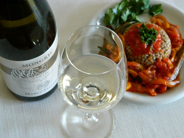 Potrawa jest bezmięsna, bez śmietanowego sosu, bez intensywnych przypraw i nie ostra. Wiodącym smakiem są pomidory i papryka. Okra rzutuje przede wszystkim na konsystencję - jest delikatnie lepka, ale nie tłusta. Zdecydowaliśmy się podać wino białe, ale ze zrównoważoną kwasowością i choćby zarysowaną strukturą dla harmonii z konsystencją sosu. Wybraliśmy Pinot Grigio z Collio (Friulia) od producenta Marco Felluga. Ciała troszkę jest (13% alk), kwasowość stonowana jak na Pinot Grigio przystało, ale mimo tego wino urzeka świeżością (2014 rocznik), soczystością i aromatycznością. Doskonale współpracuje z pomidorami, papryką, kolendrą i czosnkiem, a co najważniejsze również z okrą. Wino uzupełnia kompozycję o przyjemne aromaty działkowych winogron, zielonych jabłek oraz twardych jeszcze nektarynek.