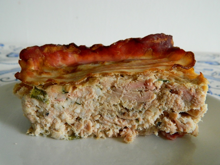 Naczynie żaroodporne wyłożyliśmy plastrami bekonu i wlaliśmy połowę masy. Kolejno wyłożyliśmy anchovies i wlaliśmy pozostałą część masy pasztetowej. Na wierzchu ułożyliśmy plastry bekonu. Całość została przykryta folią i piekła się w temperaturze 180 stopni około godziny. Po około 40 minutach pieczenia folię odkryliśmy, aby pasztet i bekon ładnie się zarumieniły. Pasztet możemy podać z zieloną sałatą i jakościowym pieczywem.