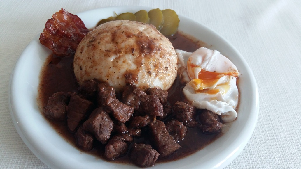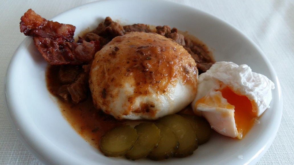 Ładny kawałek pręgi wołowej pokroiliśmy w kostkę i obsmażyliśmy na gęsim smalcu, aż mięso nabrało złotego koloru. Odłożyliśmy ją na talerz i na tym samym tłuszczu udusiliśmy pokrojone dwie cebule i trzy ząbki posiekanego czosnku. włożyliśmy z powrotem mięso, dodaliśmy liść laurowy, ziele angielskie, słodką czerwoną paprykę, tłuczony kminek, tymianek i majeranek i zalaliśmy bulionem. Całość dusiliśmy około trzech godzin, aż mięso było miękkie, a cebula i czosnek rozpadły się całkowicie zagęszczając sos. Gulasz podaliśmy z bułkami na parze z jajkiem, z wysmażonym na chrupko plasterkiem boczku i kiszonym ogórkiem.