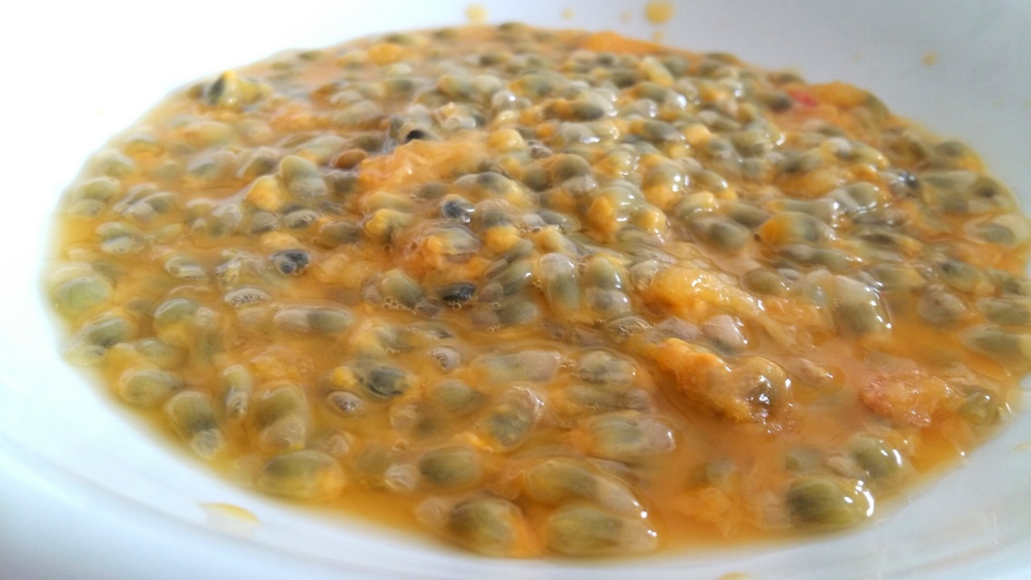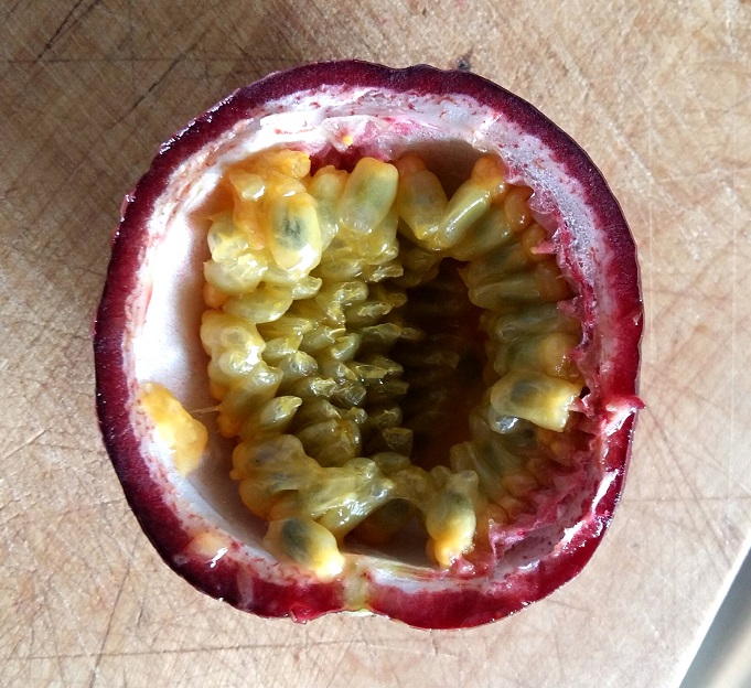 Dobry, kruchy kawałek wołowiny obsmażyliśmy na oliwie niczym go nie doprawiając. Po usmażeniu odłożyliśmy w ciepłe miejsce aby odpoczął. Wybór rodzaju mięsa zależy od naszych upodobań. Na pozostawionej na patelni oliwie obsmażyliśmy pokrojony w plasterki ząbek czosnku. Po lekkim jego zezłoceniu dołożyliśmy miąższ z trzech dorodnych marakuji. Całość została podlana białym winem (użytym do połączenia). Następnie potrawę lekko odparowaliśmy i podgrzaliśmy mięso. Mięso podaliśmy z plastrami dojrzałego ananasa.