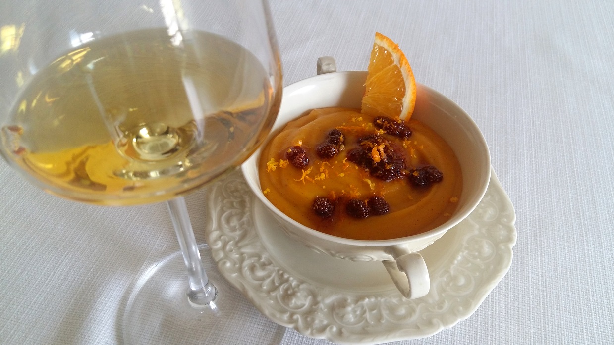 Nie ukrywamy, że było to jedno z najlepszych połączeń w historii Wino Na Widelcu. Budyń z dyni jest charakterny, i jak to z dyni, lekko mdły. Wino jest kremowe, również charakterne, dzięki czemu świetnie współgra konsystencją, ale też odświeża całość przyjemną, owocową kwasowością. Świetnie w tym wszystkim grają poziomki i skórka pomarańczy, które wzbogacają paletę smaków i aromatów. Musimy dodać, że oba składniki są słodkie, ale przy połączeniu suma słodyczy delikatnie się niweluje. Kompozycja idealna.