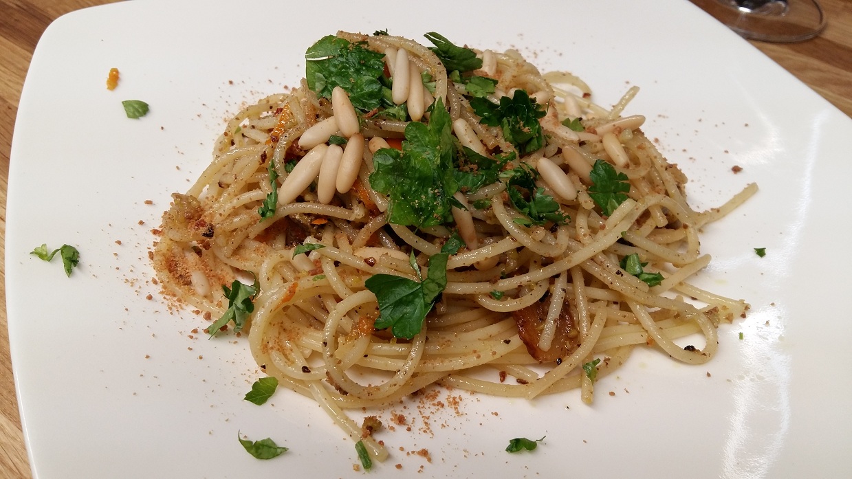 Spaghetti z bottargą. Prosty makaron, z oliwą, czosnkiem i pietruszką, dosmaczony orzeszkami pinii i bottargą - czyli suszoną, startą ikrą cefala. (To już nasze drugie podejście do bottargi)