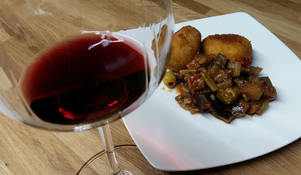 Lekko schłodzone stanowiło bardzo dobre połączenie dla caponaty. Duszony bakłażan - a był to główny składnik caponaty - potrzebuje delikatnego czerwonego wina. Tanina nie przeszkadzała, alkohol był umiarkowany, a soczystość wina współgrała z konsystencją wegetariańskiego gulaszu. Z samymi arancini nie było może idealne, ale gdy jej kawałek znalazł się w jednym kęsie z odrobiną caponaty - wszystko ulegało olbrzymiej poprawie.