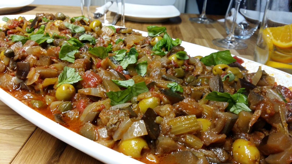 Arancini i caponata. Arancini to ryżowe kulki z nadzieniem, obtoczone bułką i usmażone. W naszych nadzienia były dwa. W jednych arancini znalazła się mozarella i szynka dojrzewająca, a w drugim wołowe ragu. Caponata to wegetariański "gulasz" na bazie bakłażana, jednak składników jest o wiele więcej - seler naciowy, cebula, czosnek, pomidory, kapary, oliwki, a całość doprawiona cukrem, octem balsamicznym, oliwą oraz solą i pieprzem.