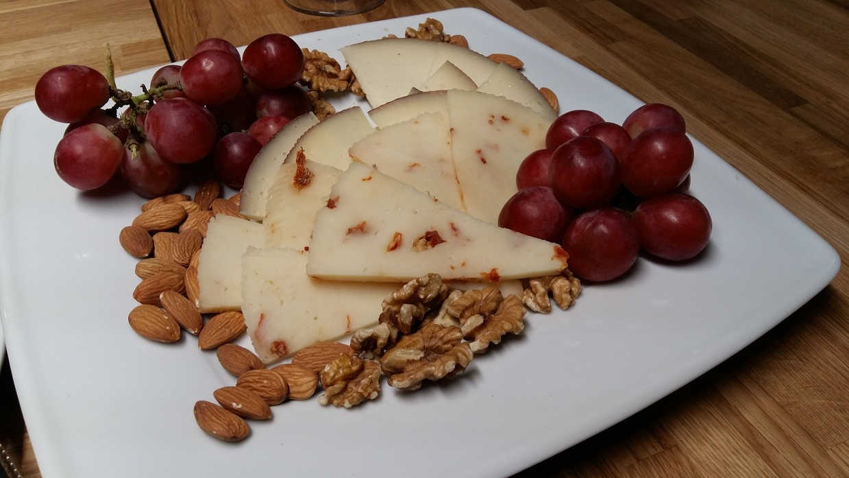 Pecorino z powidłami z przemarzniętych na drzewie śliwek węgierek, winogronami, orzechami i migdałami.
