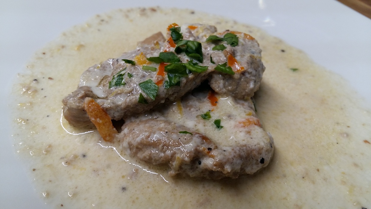 Eskalopki cielęce w sosie winno-śmietanowym (białe wino) z dodatkiem skórki cytryny i pomarańczy oraz szczyptą pietruszki.
