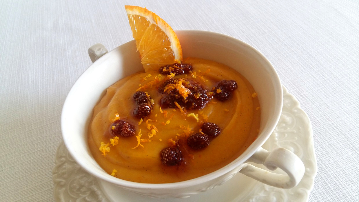 Iga otrzymała od przyjaciela Petara Lyanguzova słoiczek konfitur poziomkowych. Konfitury powstały z poziomek rosnących w bułgarskich lasach, a smażyły je panie od lat trudniące się wyrobem konfitur. Wierzcie nam, są obłędne, z całymi owocami poziomek wewnątrz. Postanowiliśmy wyczarować deser godny takiego rarytasu. Maciej zaproponował domowy budyń waniliowy, a Iga udoskonaliła pomysł o główny składnik budyniu - dynię.