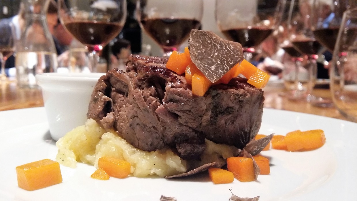 Jakie wino do steka? Pytanie niby łatwe i wielu odpowie od razu, ale wbrew pozorom diabeł tkwi w szczegółach. Na idealny dobór wina ma wpływ wiele czynników. Wszystko zależy od rodzaju mięsa, od tego w jaki sposób było przygotowane (np. grillowane czy sous-vide), od stopnia wysmażenia (np. surowy czy well-done), jak również od sosu i dodatków. Stek z polędwicy wołowej, do którego dziś dobieram wino, był przygotowany sous-vide (przez 3 godziny w temperaturze 58 stopni). Dzięki czemu nie miał w sobie krwi (chociaż był różowy), a więc nie potrzebowaliśmy zbyt wielu tanin w winie do ścięcia białka. Konsystencja polędwicy była bardzo delikatna, mięso wręcz rozpływało się w ustach. Metodą podobieństw, do dość lekkiej potrawy potrzebujemy dość lekkiego wina. Nadarzyła się okazja by spróbować połączyć polędwicę (z odrobiną trufli i puree ziemniaczanym z oliwą truflową) z trzema dojrzałymi Chianti Classico od słynnego producenta Mazzei.