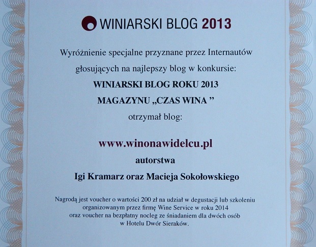 Wino Na Widelcu zostało nominowane w konkursie Winiarski Blog 2013, którego organizatorem był Czas Wina. Nominowano 20 blogów o różnej charakterystyce i około-winiarskiej tematyce. Przez dwa ostatnie miesiące można było głosować na "Najlepszy Blog Winiarski" w celu przyznania nagrody publiczności. To dzięki Waszym głosom i determinacji Wino Na Widelcu uzyskało najwyższą ilość punktów i po dramatycznej końcówce głosowania wygraliśmy Grand Prix - nagrodę publiczności!
