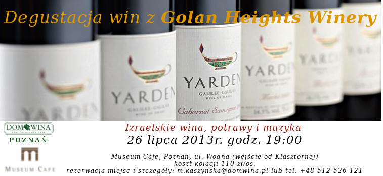 W imieniu organizatorów, zapraszamy na degustację win z Golan Heights Winery, która odbędzie się w piątek 26 lipca w Poznaniu. Szczegóły na plakacie. Do win zostaną zaproponowane przekąski, odpowiednie do serwowanych win.