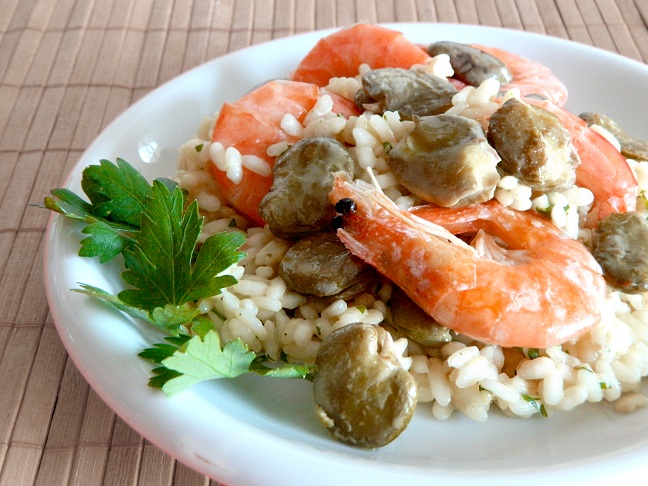 Dobrodziejstwa sezonowych warzyw w pełni. Tym razem na naszych celownikach pojawił się bób. Warzywo powszechnie uważane za mało efektowne wizerunkowo, ale jego fani wiedzą, że to małe zdradliwe nasionko potrafi spowodować serię spektakularnych bąków uwieść smakiem i uzależnić jak pistacje. Niech przyzna się ten, kto choć raz nie zjadł całej miski świeżo ugotowanego, młodego i jędrnego bobu... Dziś serwujemy Wam risotto z bobem i krewetkami. Użyliśmy włoskiego ryżu carnaroli pochodzącego z prowincji Vercelli, który ze względu na swoją popularność nazywany jest "królem ryżów". Jest to ryż najczęściej używany do przygotowania risotto, dlatego że podczas gotowania utrzymuje swój kształt i zachowuje oczekiwaną konsystencję.