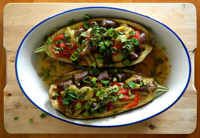 Sok który wypłynął wytarliśmy. Wydrążyliśmy środek bakłażana i pokroiliśmy go w kostkę, a następnie dodaliśmy do gulaszu. W międzyczasie upiekliśmy czerwoną paprykę w piekarniku, aż skórka stała się prawie czarna. Po ostudzeniu obraliśmy ze skórki i pociętą w paseczki dodaliśmy do gulaszu. Następnie skroiliśmy młodą cebulkę i również dorzuciliśmy do "serdecznej" potrawy. Dusiliśmy wszystko ok 30 min soląc i pieprząc do smaku. Po zakończeniu duszenia, nafaszerowaliśmy wydrążone bakłażany przygotowanym gulaszem i ułożyliśmy w naczyniu żaroodpornym podlewając niewielką ilością sosu. Całość piekliśmy 20 minut w piekarniku nagrzanym do 180 stopni. Dla ozdoby udekorowaliśmy szczypiorkiem.