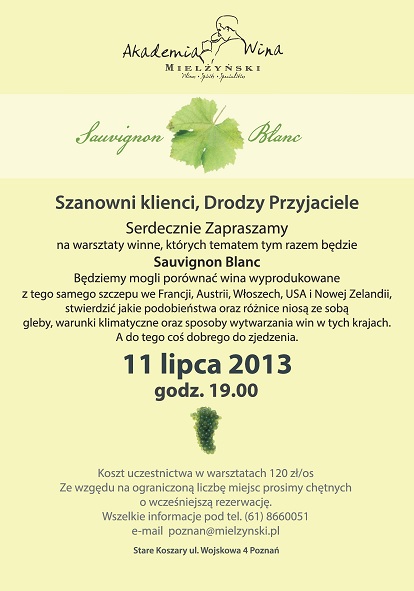 Już niebawem, 11 lipca (czwartek), druga edycja warsztatów Akademii Wina Mielżyński w Poznaniu. Tym razem temat skupiony na winach z jednego szczepu, dającego różne efekty w różnych częściach świata. Jak zwykle winom będą towarzyszyć odpowiednio dobrane potrawy. Ilość miejsc ograniczona, więcej informacji na plakacie.