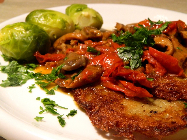 Gęsie żołądki dokładnie umyliśmy i sparzyliśmy. Następnie po oczyszczeniu pokroiliśmy w paski i dusiliśmy na oliwie extra virgin ok 1,5 godziny aby zmiękły. W tym czasie oczyszczone rydze podsmażyliśmy na klarowanym maśle, dodając nasze suszone pomidory w oliwie z ich marynaty. Na koniec połączyliśmy składniki, doprawiając tłuczonym zielem angielskim, jałowcem i czosnkiem. Placki ziemniaczane usmażyliśmy na gęsim smalcu.