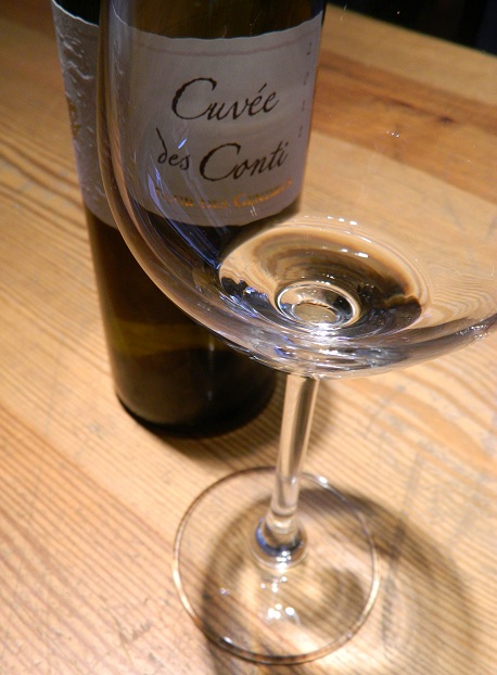 Przyznamy, że zastanawialiśmy się dłuższą chwilę nad doborem wina. Najpierw spróbowaliśmy wina czerwonego, portugalskiego Douro, które akurat mieliśmy pod ręką. Okazało się, że intensywna czerwień zbytnio zdominowała potrawę. Chcieliśmy by rydze, tak poszukiwany składnik, były wyczuwalne w smaku. Dlatego zdecydowaliśmy się spróbować z winem białym o dobrej strukturze. Takim jest Cuvee de Conti z francuskiego regionu Bergerac. To organiczne wino wytworzone jest z trzech występujących w Bergerac szczepów - Semillon 70%, Sauvignon Blanc 20% i Muscadelle 10%. Kolor jest niezwykle jasny, blado-złoty. Aromat zaskakuje, ponieważ nie spodziewaliśmy się takiej złożoności i słodyczy w winie wytrawnym z 2012 roku. Dominują nuty dojrzałych, a nawet lekko przejrzałych, białych winogron, kwiaty akacji i pomarańczy oraz delikatna i biała brzoskwinia. W ustach pełne, złożone i krągłe. Niby wytrawne, ale jednocześnie słodkie w odbiorze. Dzięki tej kombinacji struktury i owocowej słodyczy, wino to świetnie zgrało się zarówno z gęsimi żołądkami, jak i podkręciło mięsisty smak rydzów smażonych na masełku.