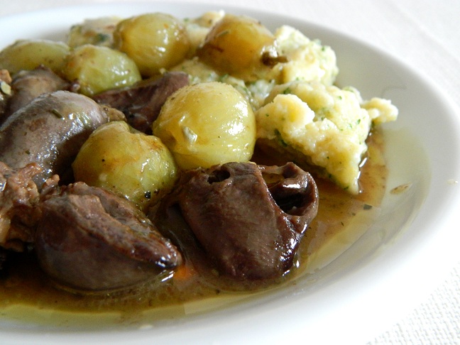 Mamy wrażenie, że w ostatnich dniach gęsina opanowała świat, a przynajmniej ten, który nas otacza. Nie ważne czy włączamy TV, słuchamy radia, czytamy menu restauracyjne, czy nawet robimy zakupy w sklepie - zewsząd polecają gęsinę na św. Marcina. Daliśmy się ponieść fali, ponieważ uważamy gęsinę za dobre mięso, ale jak to my, pójdziemy odrobinę pod prąd. Dziś nie będzie piersi, nogi czy skrzydełka, ani nawet wątróbki... Dziś od nas dla Was na św. Marcina (11.11.) - gulasz z serduszek gęsich w sosie z winogronami, podany z francuskimi kluseczkami.