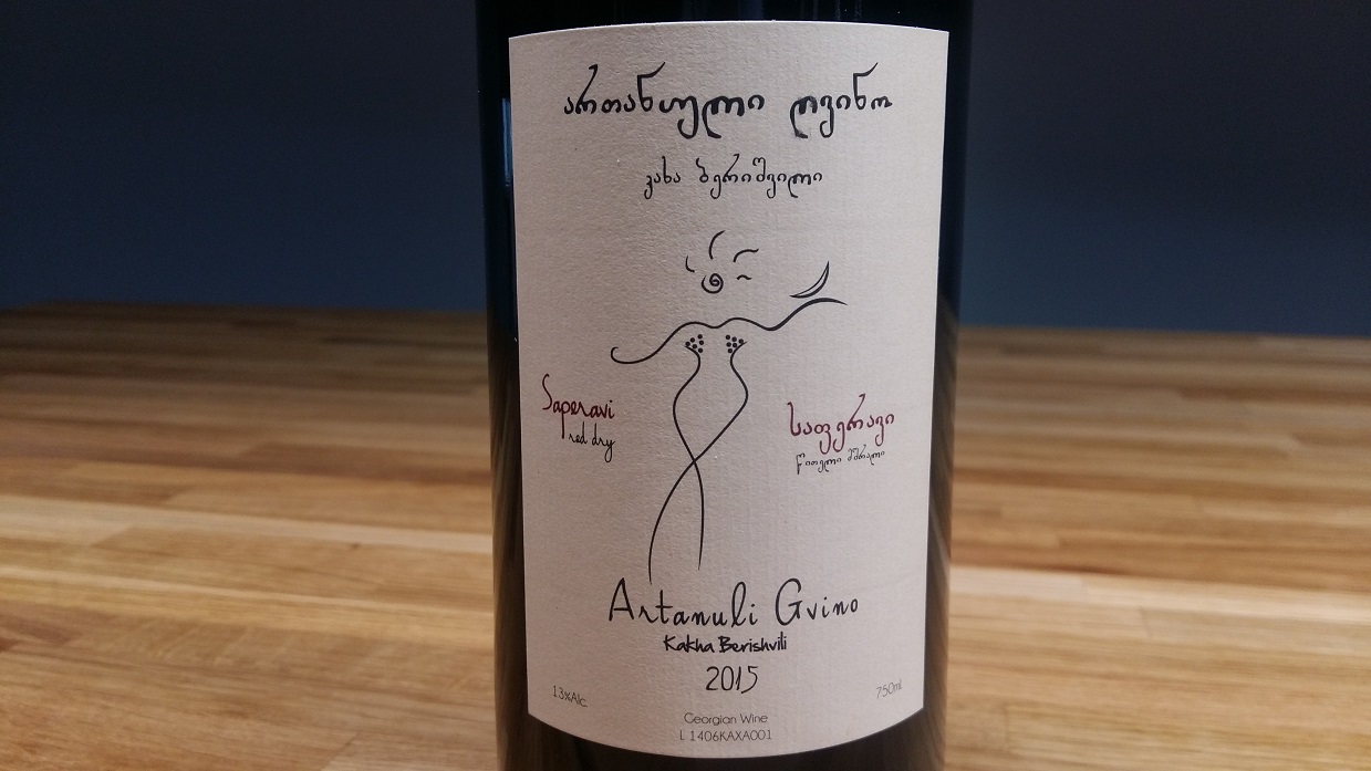 Młode Saperavi, klasyczny, czerwony szczep Gruzji (najbardziej rozpoznawalny na świecie). Ma grubą skórkę (która rzutuje na ilość tanin), sporo pigmentu i czerwony miąższ (Saperavi również jest tenturierem). W efekcie wina są tak taniczne, że mogą rywalizować z Sagrantino i tak ciemne, że przypominają "wina czarne" - Malbec z Cahors. Wino atakuje aromatem jagód i czarnego bzu, ale można doszukać się także wędzonch śliwek, atramentu, skóry i egzotycznego drewna. Usta witalne i nieokrzesane. Tanina ostra, nieco balansowana soczystą kwasowością. W smaku również jagoda, śliwka węgierka ze skórką, ale pojawia się dojrzała, choć cierpka wiśnia. Finisz ziołowo-roślinny, jakby liściasty.