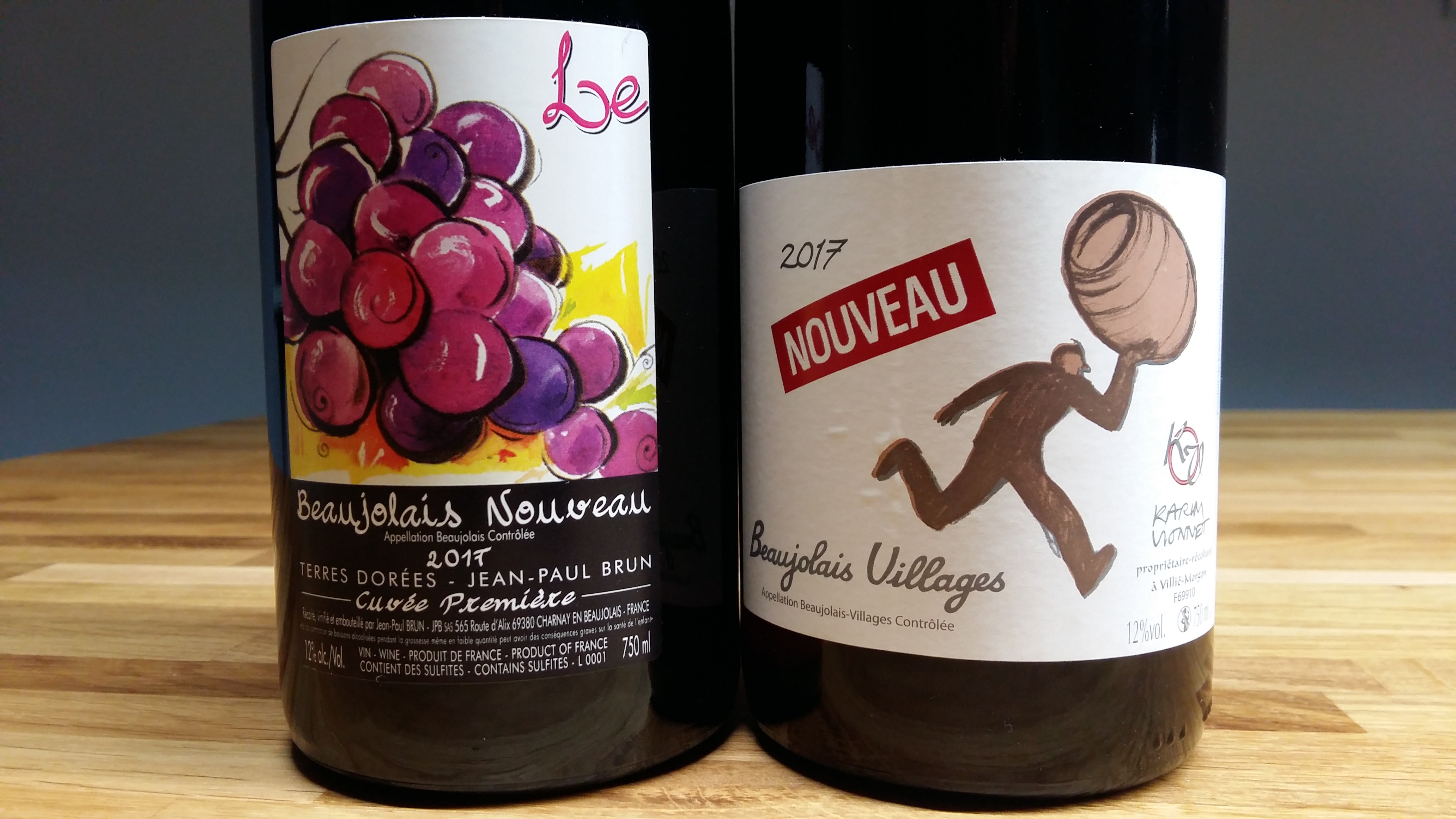 Zacznijmy oczywiście od Nouveau. Wybrałem dwa, które pokazują jakość (co nie jest typowe dla tego stylu) i dwa wykonane inaczej. Nouveau od Jean-Paul Brun'a powstało podczas klasycznej maceracji, a od Karim Vionneta'a poprzez macerację węglową, a w zasadzie częściowo-węglową (semi-carbonic), ponieważ wyraźnie czuć w nim taninę. Nouveau według zasad apelacji nie musi powstawać poprzez macerację węglową, natomiast można użyć na nie grona zarówno z AOP Beaujolais (Brun), jak i AOP Beaujolais Villages (Vionnet).